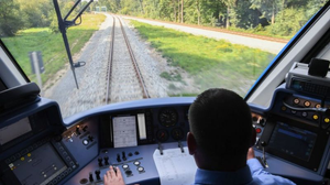 A conductor directs the first hydrogen-powered train, from French train manufacturer Alstom, during its maiden journey on September 16, 2018, near Bremervoerde, Germany.